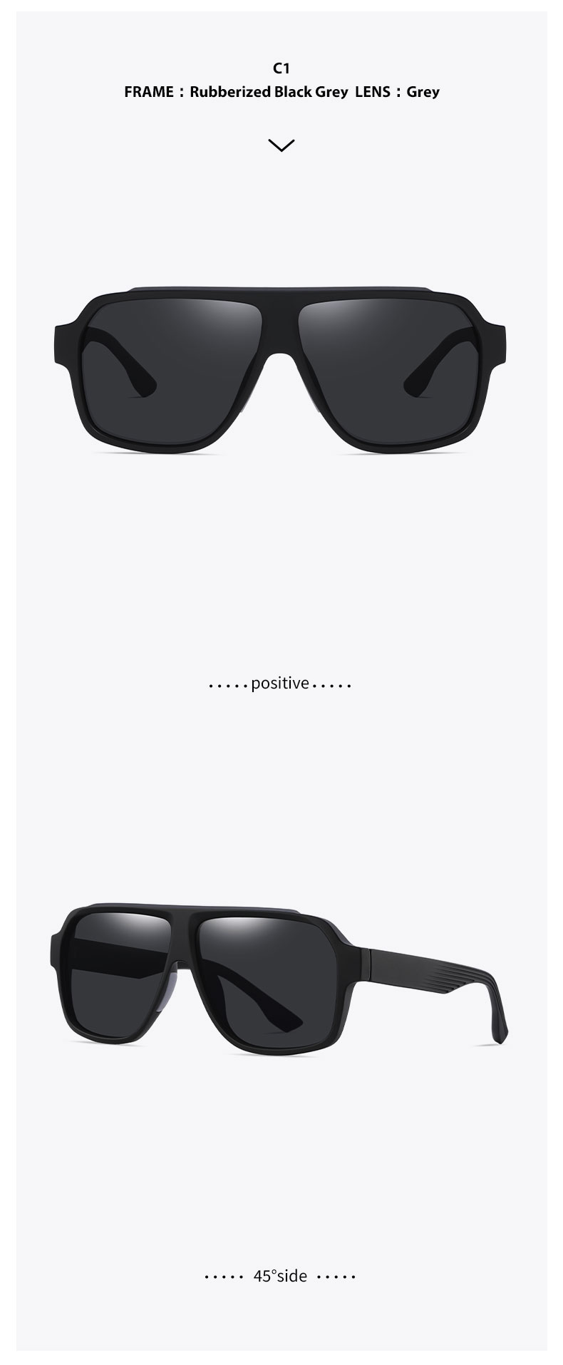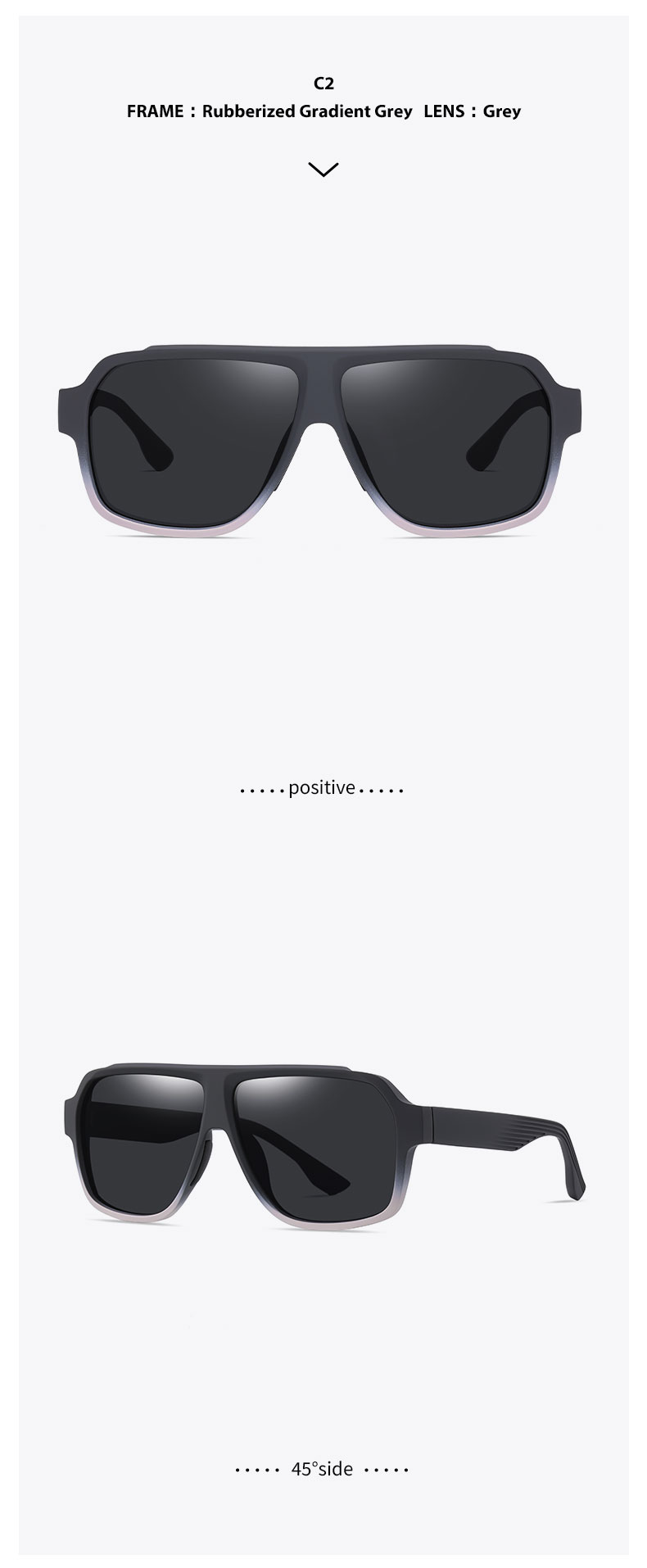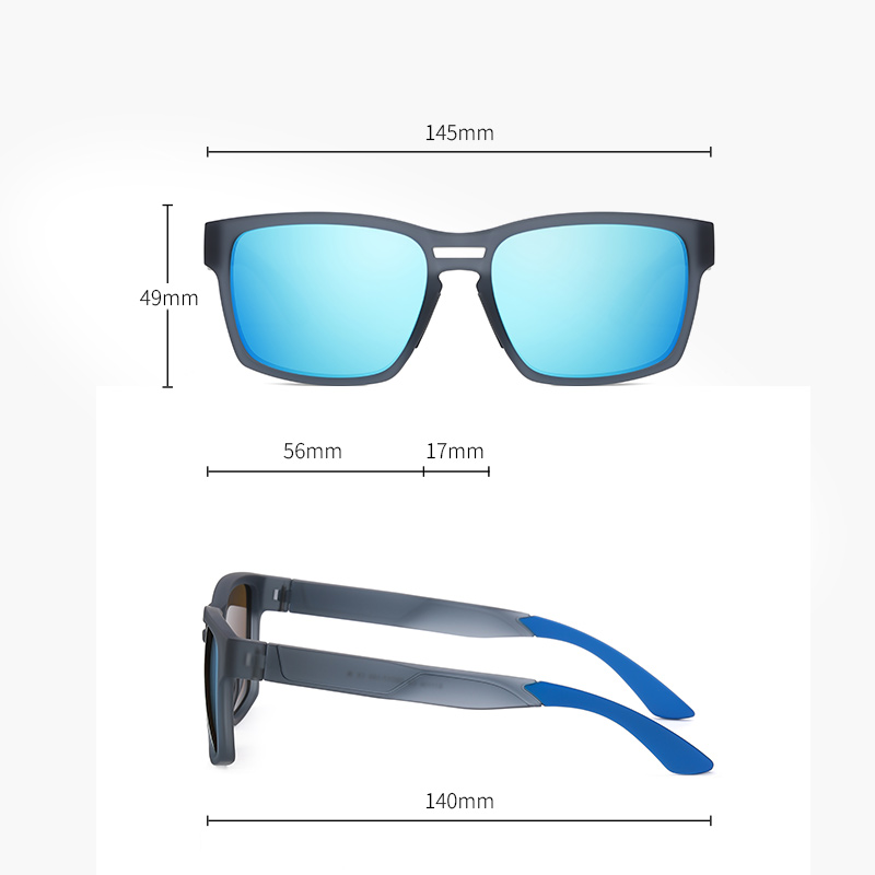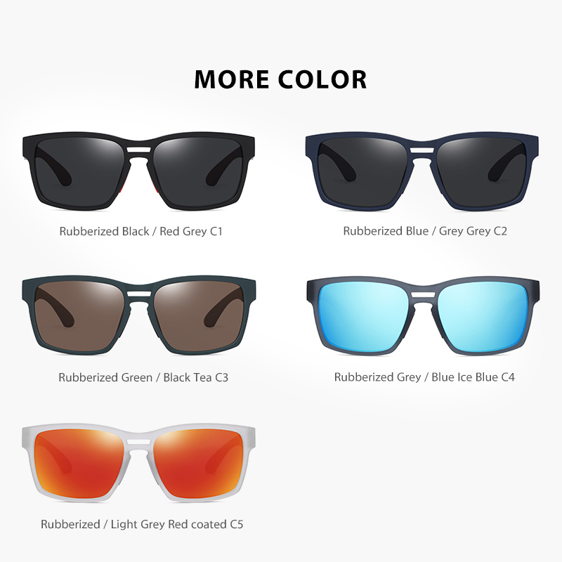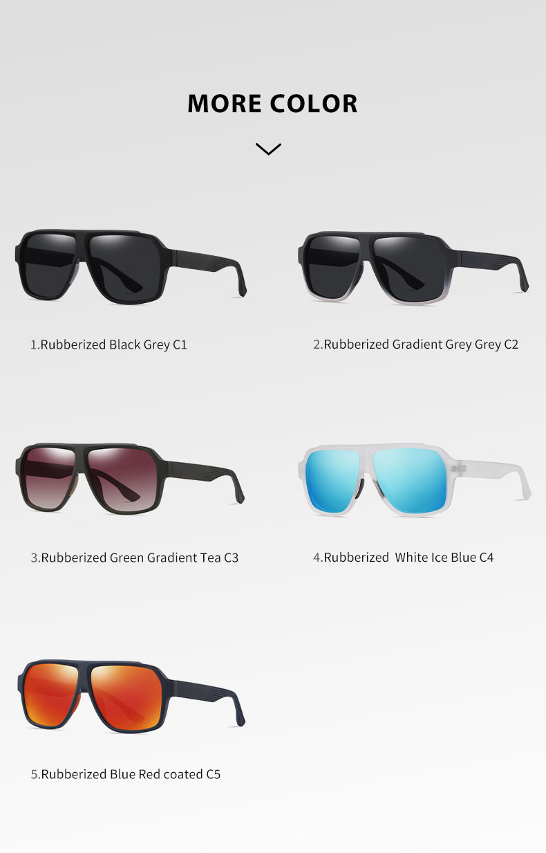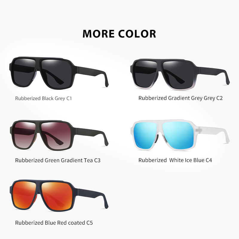 Rubberized black frame/Grey lens, Rubberized blue frame/Red coated lens, Rubberized Gradient Grey frame/ Grey lens, Rubberized green/Gradient tea lens, Rubberized white frame/Ice blue lens